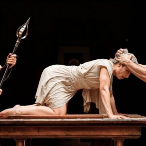 A seda está apertando seus pulsos. Não corda, seda. Cara, deliberada, porque seda não deixa marcas. Você está ajoelhada em pedra molhada numa…