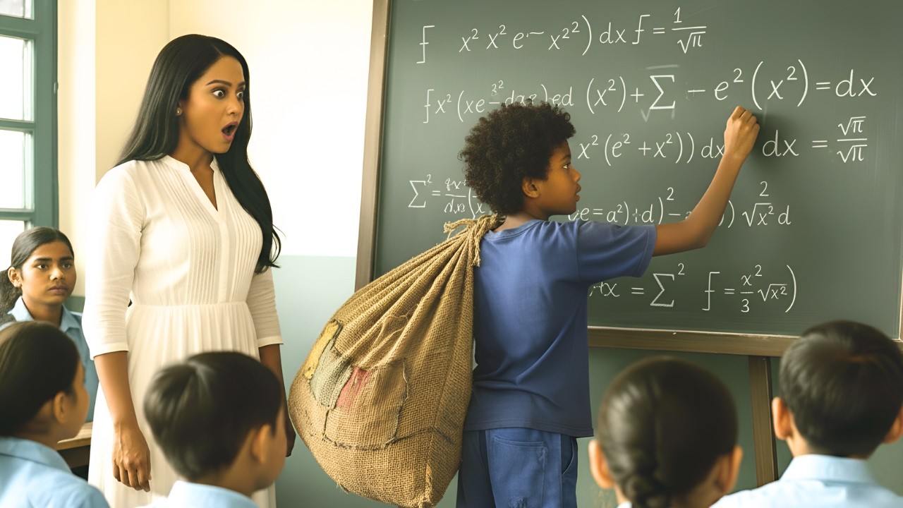 Chegou em frente ao quadro, o giz na borda. O velho cálculo ainda estava lá, sempre errado, sempre nos livros há anos, sem que ninguém percebesse. Uma criança sem caderno, sem livro, sem uniforme estava prestes a corrigir um erro que todo um sistema ignorara.