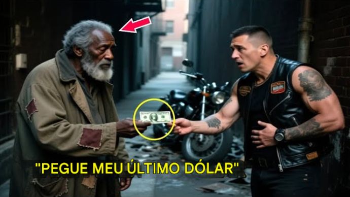 Mas quando um motociclista cansado, vestido de couro, cambaleou por um beco frio numa noite, segurando o estômago com fome, o homem sem-teto fez algo que chocaria o mundo.