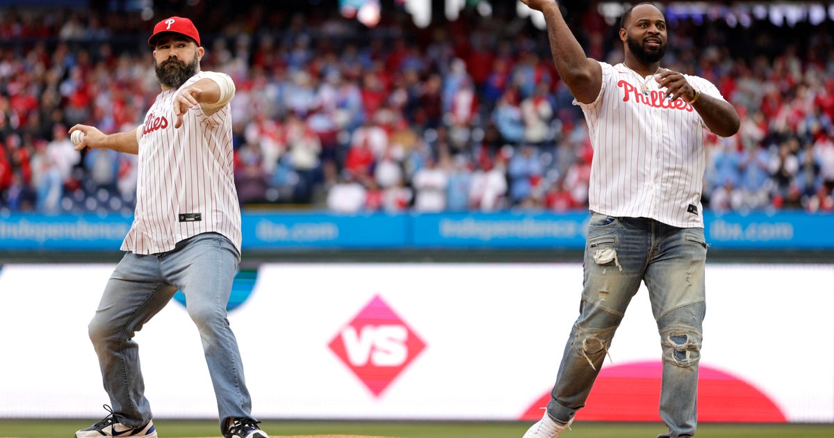 Jason Kelce and Fletcher Cox met their baseball counterparts before throwing the first pitch at Citizens Bank Park on Saturday.
