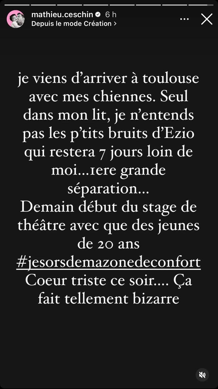 Une « première grande séparation » comme l’écrit Mathieu Ceschin qui s’annonce difficile. Cependant, l’ancien éleveur de chevaux aura de quoi se changer les idées grâce à sa reconversion professionnelle. À 49 ans, il a décidé de changer totalement de carrière. Son stage de théâtre qui débute ce lundi fait partie intégrante de ce projet. Le père célibataire partageait justement dans sa story son stress à l’idée d’être entouré de jeunes comédiens en herbe : « Demain début du stage de théâtre avec que des jeunes de 20 ans #Jesorsdemazonedeconfort. »