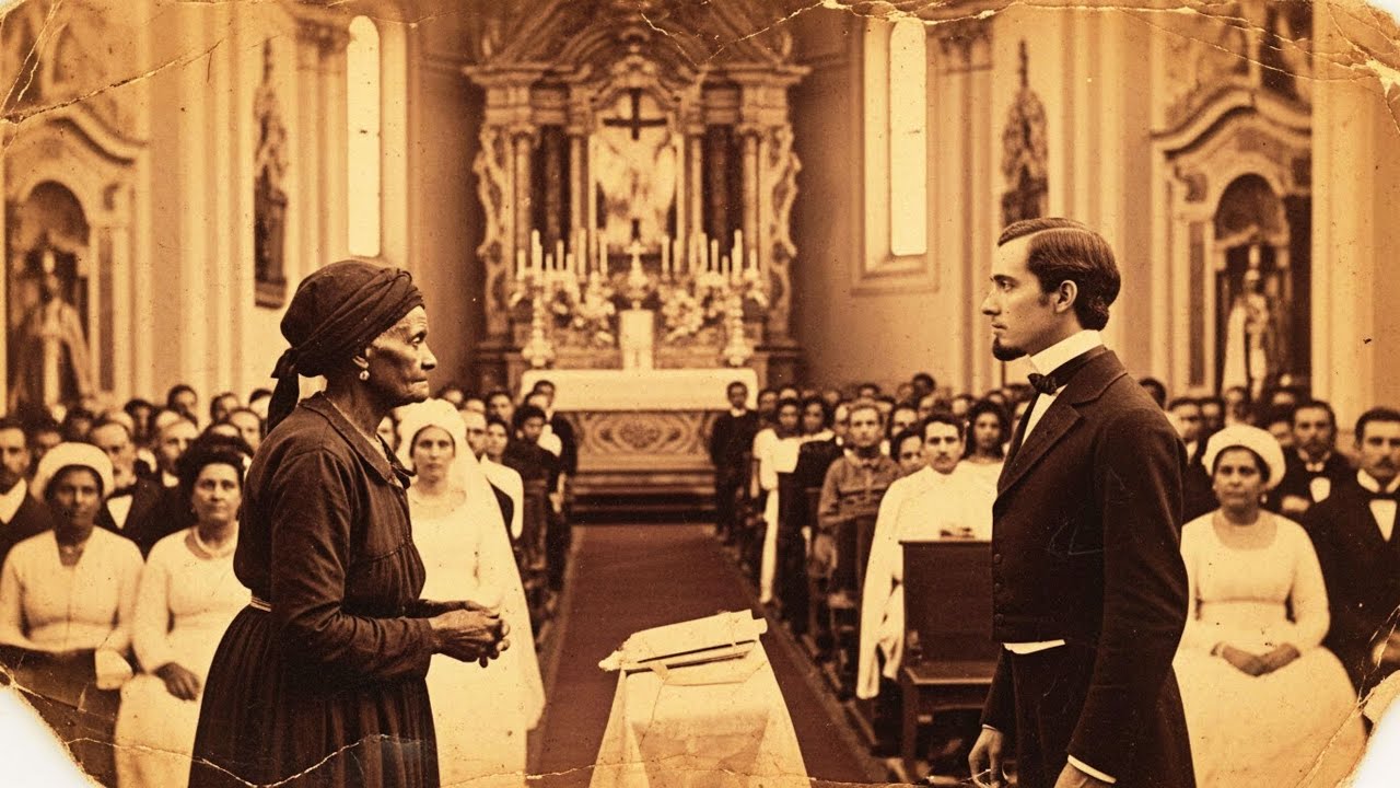 Rafael se casava aos 18 anos com Ana Clara. Filha de outro barão, união de fortunas, união de poder. A capela estava lotada. 300 convidados à elite do Vale do Paraíba, vestidos de seda francesa, fraques ingleses, champanhe importado. Era o casamento do ano, talvez da década. E na entrada da capela estava Catarina, escrava, 43 anos, ama de leite, ou melhor, havia sido ama de leite, de Rafael.