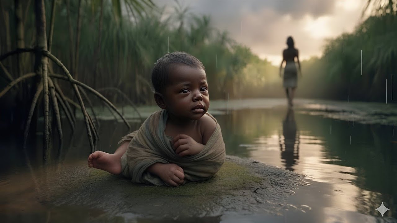 A chuva tinha acabado de começar quando a mãe pisou no pântano. Seus passos trêmulos sussurravam o peso de sua decisão. O bebê agarrava-se ao calor dela, inconsciente do que o esperava. Nuvens escuras se acumulavam como se lamentassem a dor em seu coração. Ela parou, encarando o mundo que nunca lhe havia mostrado misericórdia. O suave balbucio do bebê quebrou sua determinação já despedaçada, lágrimas se misturaram à lama enquanto ela o baixava no chão molhado. Suas mãos demoraram em seu minúsculo corpo por um último momento frágil.