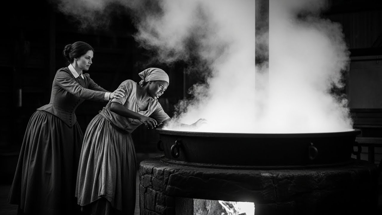 Mas durante a punição, algo mudou em sua expressão. Enquanto observava o feitor João aplicar as chibatadas, seus olhos se fixaram nos caldeirões, fervendo atrás do escravo castigado. Uma ideia começou a tomar forma em sua mente. Uma ideia tão terrível que até mesmo ela hesitou por um momento antes de verbalizá-la. Pare”, ordenou ela após 10 chicotadas.