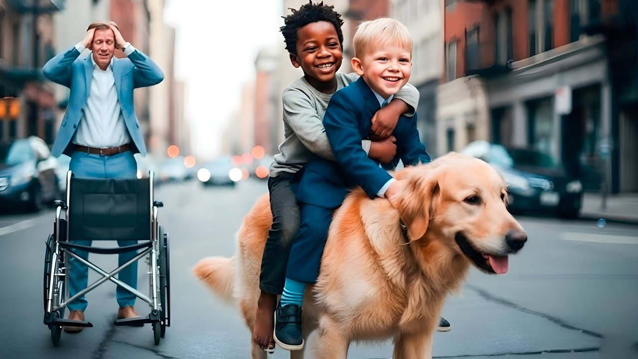 Seu filho, Gabriel, antes uma figura imóvel na cadeira de rodas, estava agora montado em um cão gigante de pelagem dourada, um Golden Retriever majestoso, cujas patas trotavam com orgulho e determinação. Agarrado aos ombros de Gabriel estava um estranho, um garoto de rua com roupas gastas, mas com um sorriso que irradiava uma luz perturbadora em meio à tensão fria da manhã.
