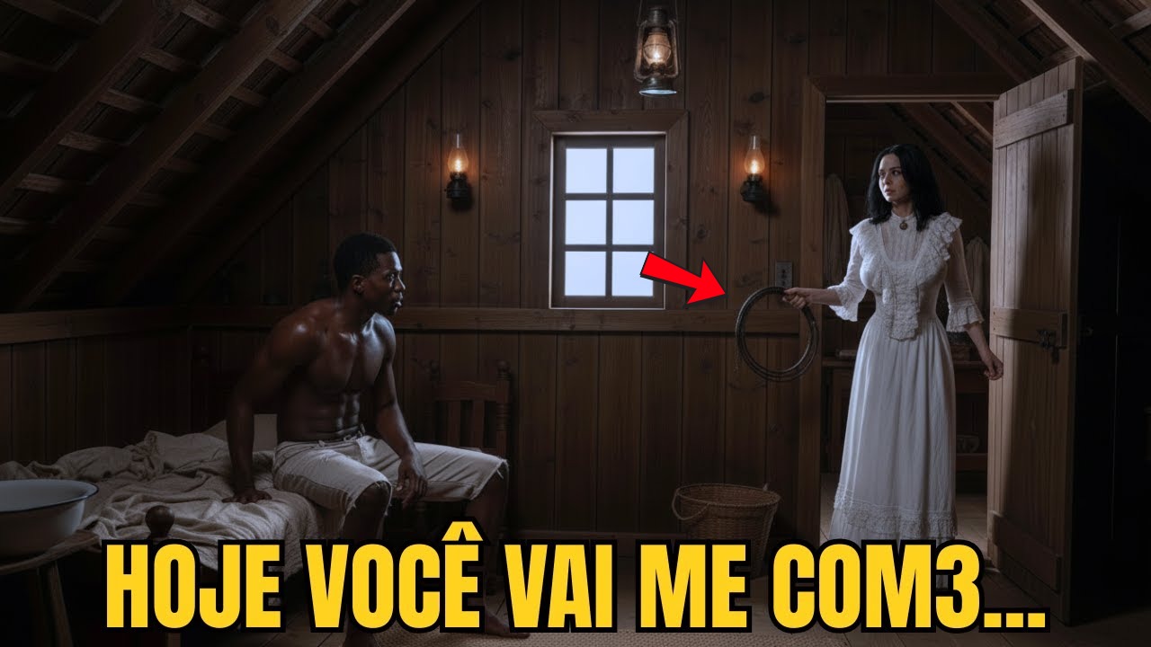 um homem chamado Jerônimo, cuja existência era apagada dos livros da fazenda, mas cujo corpo era exigido todas as noites quando a lua subia e a casa silenciava. Ninguém falava, mas todos sentiam. Ninguém via, mas todos sabiam. E o que acontecia naquele sótão era um segredo que ardia na alma de cada escravo que cruzava o corredor e ouvia os passos dela subindo a escada de madeira, rangendo sob o peso de um desejo que a sociedade jamais perdoaria.