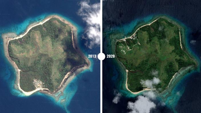 Vue aérienne de l’île de Buliya en 2013 et en 2020 Captures écran Google Earth (montage)