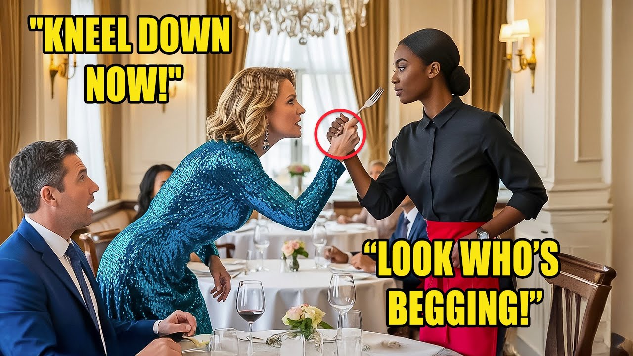 Ajoelhe-se. O grito de Victoria Sterling cortou o silêncio elegante do Lejardan como um trovão. Duzentos pares de olhos do outro lado do salão se voltaram para a mesa VIP, onde a esposa do milionário permanecia rígida como uma rainha, dando ordens. Sua pulseira de diamantes refletia a luz enquanto ela apontava para a garçonete negra à sua frente.
