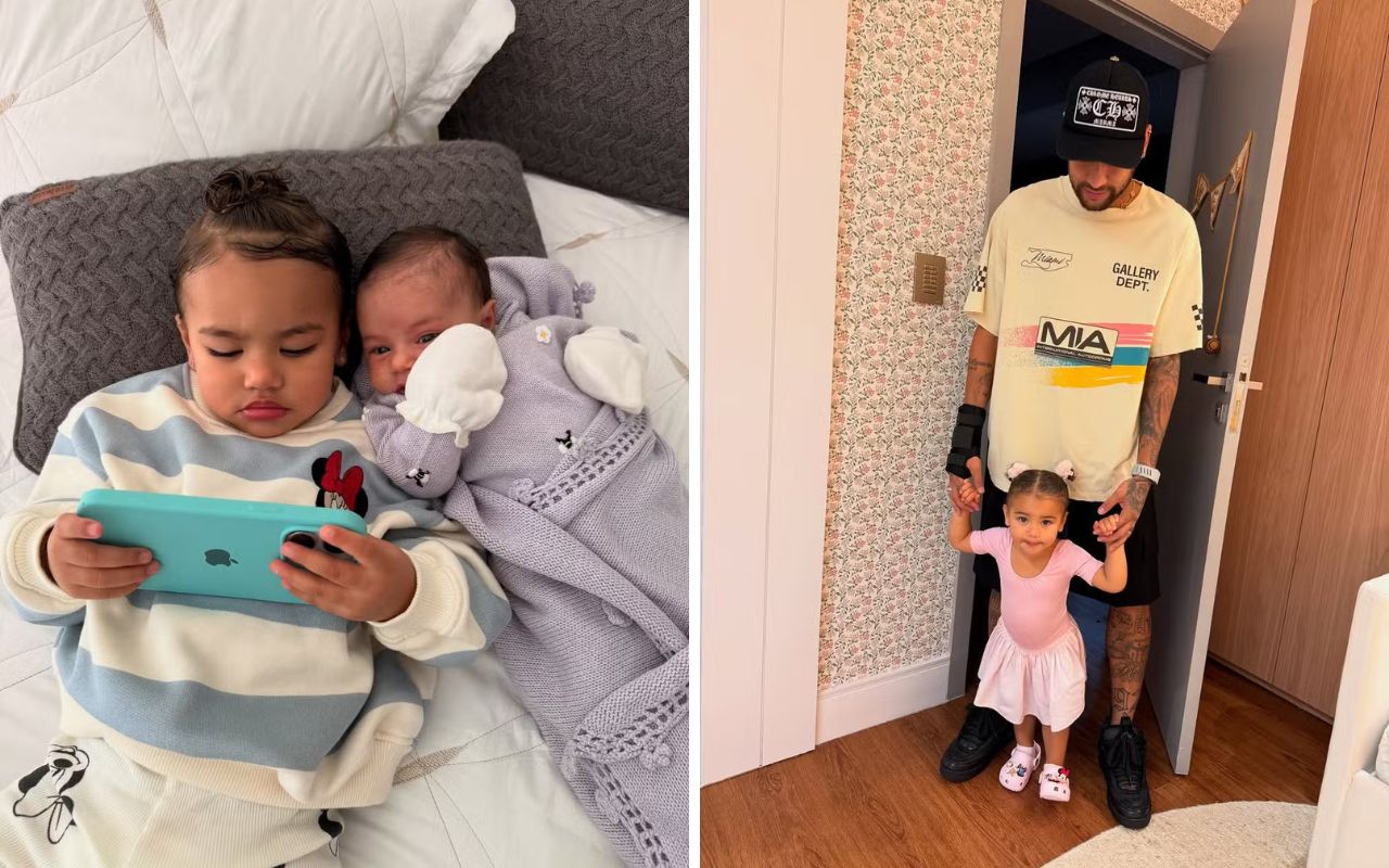 As imagens mostram momentos íntimos, como Neymar segurando as meninas, Bruna com Mel recém-nascida nos braços, e até um registro do parto. Também aparece Davi Lucca, de 13 anos, filho de Neymar com Carol Dantas, brincando com Mavie. O jogador, de 33 anos, também é pai de Helena, de 1 ano, fruto da relação com Amanda Kimberlly.