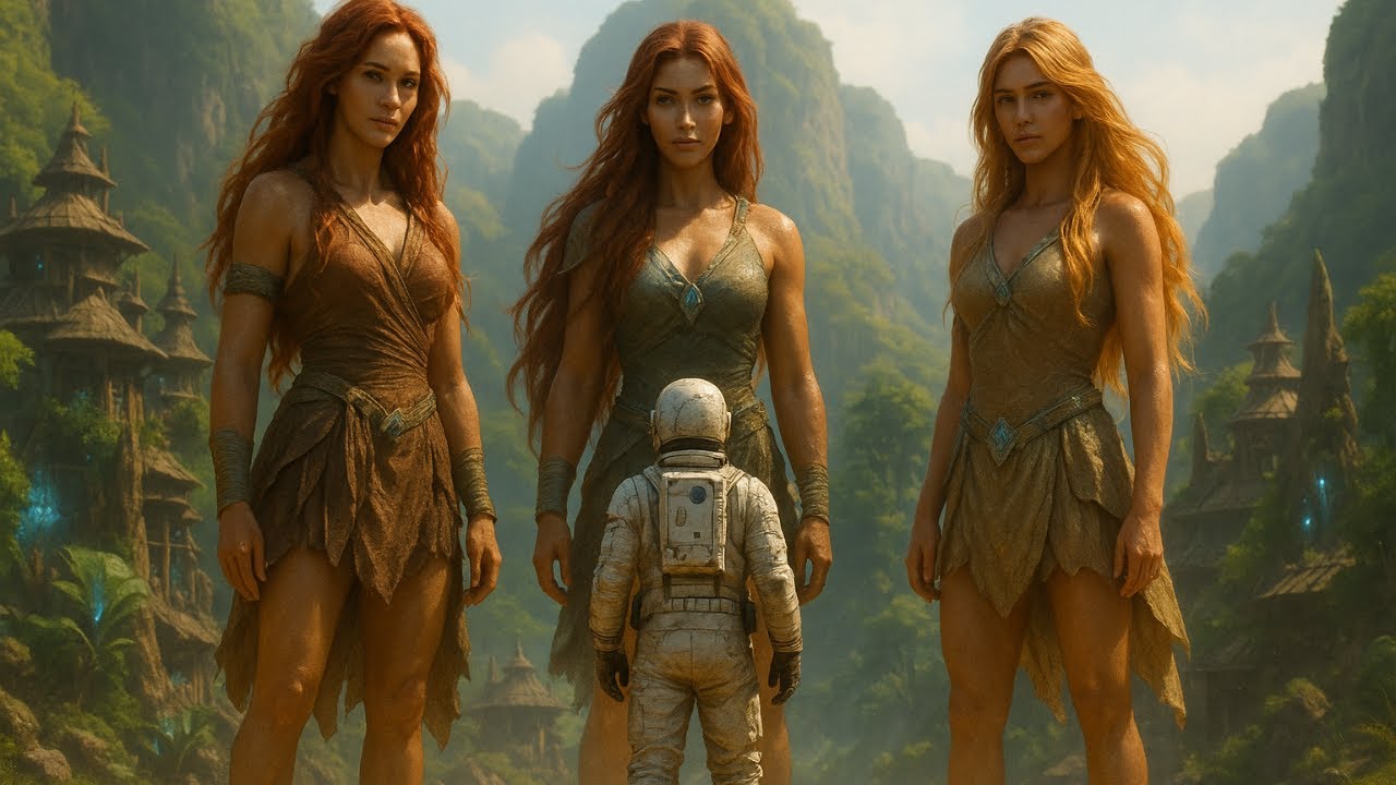 Então eu vi as outras. Elas caminhavam entre lagos brilhantes, rindo, seus corpos semicobertos por tecidos estranhos que cintilavam como vidro líquido. Uma tinha a pele prateada e cabelos translúcidos. Outra tinha marcas no rosto que pareciam vivas, mudando levemente quando ela se movia. Cada uma delas era enorme, mas o que mais me assustava não era o tamanho.