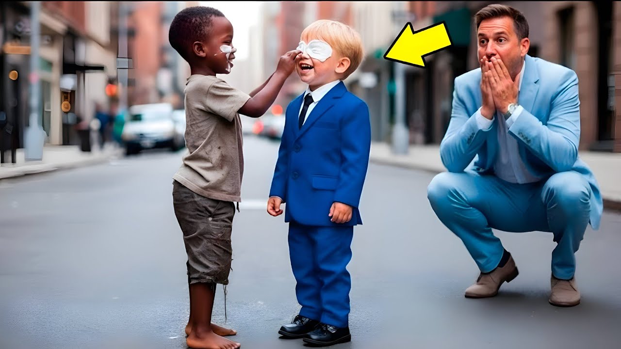 Por um segundo, o mundo parou. Um homem de terno agachado na rua suja, chorando baixinho, enquanto duas crianças — uma descalça, outra de terno azul — riam sob o sol.