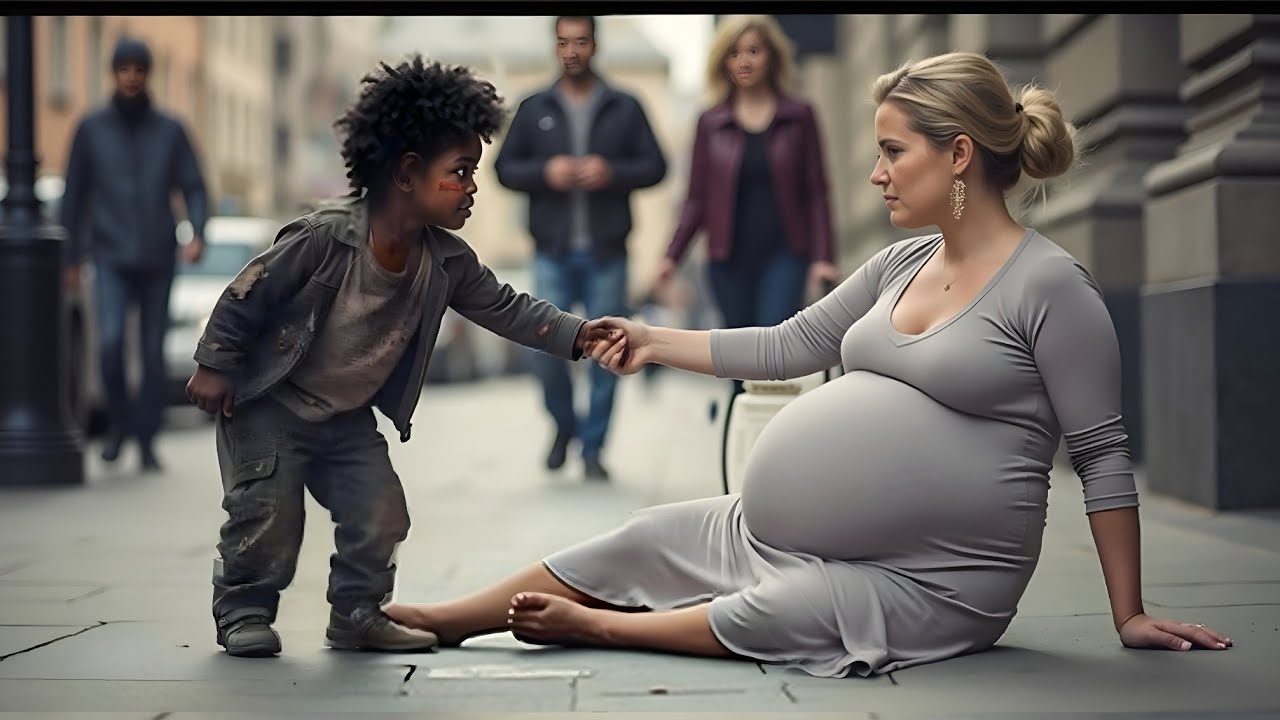 Mesmo assim, o menino não parou. Ele correu até uma mulher com um casaco roxo, puxou sua manga. “Senhora, ela precisa de ajuda! Ela vai perder o bebê!”