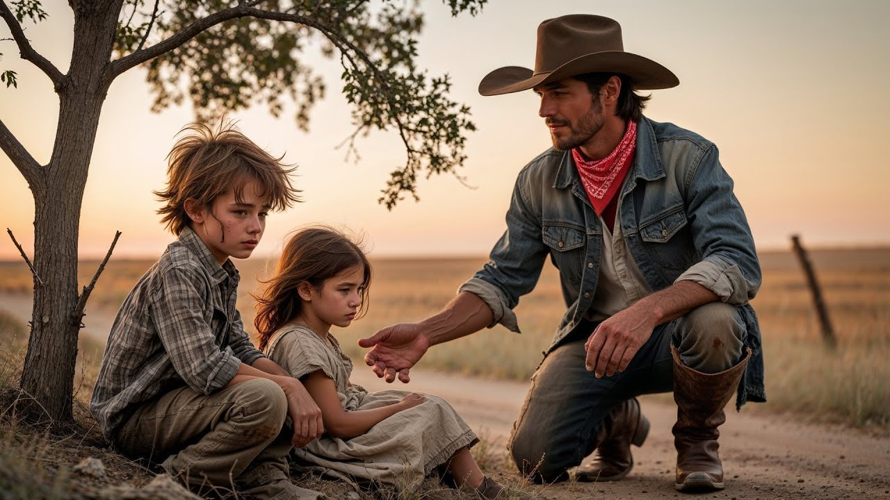 O menino olhou para cima, o rosto sujo de terra e lágrimas, os olhos arregalados de medo e exaustão. “O que aconteceu aqui, filho?”, perguntou Cole, abaixando-se para ficar na altura da criança, tentando manter a voz suave, apesar de sua figura imponente. O menino apertou a irmã contra si. “Minha mãe e meu pai pegaram febre… E depois não acordaram mais.” Sua voz quebrou. “Estamos andando há dias. A Emma tá doente também. Não come nada.” Cole tocou a testa da menina, sentindo o calor ardente da febre. Ele já tinha visto isso outras vezes – órfãos tentando sobreviver na implacável fronteira.