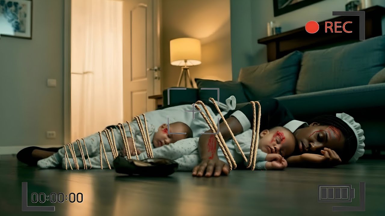 Lá dentro, Grace estava no chão, exatamente como na filmagem, seus braços amarrados frouxamente com um cabo. Os gêmeos estavam ao lado dela, ilesos, mas chorando baixinho.