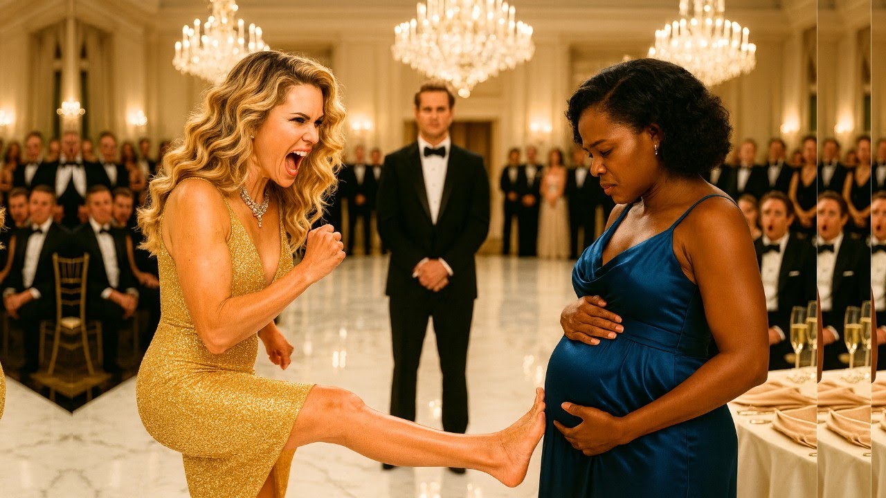 Não toque no meu marido!” A frase ecoou pelo salão de mármore do hotel mais caro de São Paulo, atravessando a música, os brindes e os sorrisos falsos. Camila, 34 anos, vestido dourado, brilhando sob lustres de cristal, avançou como uma fera em direção à mulher grávida de azul e, diante de centenas de convidados, ergueu a perna e encostou o pé com força na barriga dela, como se quisesse empurrá-la para longe de sua vida perfeita.