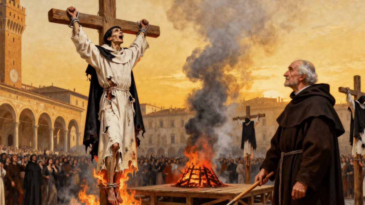 A menos de 100 m de distância, um homem de 45 anos que mal podia caminhar devido às torturas recebidas durante as últimas duas semanas, escutava os gritos da multidão que pedia sua morte. Seu nome era Dirolamo Savonarola e apenas do anos antes essa mesma multidão o consideravam profeta enviado por Deus. Agora o chamavam de herege e traidor.