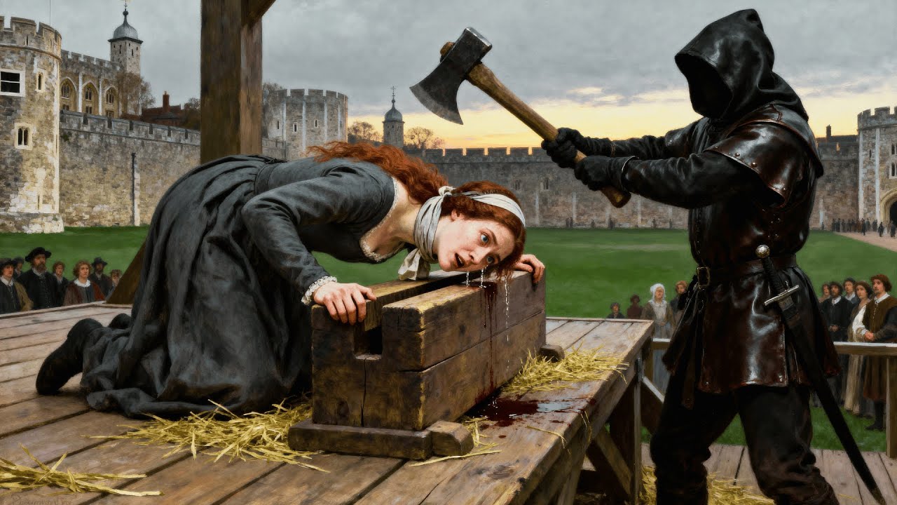 Agora vem a parte que ninguém te conta, a parte que te faz questionar o que os seres humanos são realmente capazes de fazer uns aos outros. Na manhã do dia 11 de fevereiro, 24 horas antes da execução, Jane acordou com o som de uma construção: martelos batendo, madeira sendo cortada, vozes gritando comandos. Ela foi até a janela de sua cela e olhou para fora. E lá, no pátio abaixo, bem na frente de sua janela, eles estavam construindo o cadafalso, o palco onde ela seria decapitada. Eles podiam ter construído em qualquer lugar. A Torre de Londres tinha espaços privados, pátios internos longe das celas dos prisioneiros, mas não. Eles deliberadamente construíram o cadafalso diretamente na linha de visão de Jane e a forçaram a assistir. Cada tábua sendo pregada, cada poste sendo fincado no chão, cada teste do alçapão onde sua cabeça cairia, ela viu tudo durante oito horas inteiras. Um documento descoberto em 2007 nos arquivos da Torre, escrito por um guarda chamado Thomas Bridges, descreve como Jane ficou paralisada na janela durante todo o dia. Ela não se moveu, não comeu, apenas ficou ali observando os homens construírem o lugar de sua morte. E aqui está o detalhe que vai te partir ao meio. Quando o cadafalso ficou pronto, quando a última tábua foi pregada e os carpinteiros se afastaram para admirar seu trabalho, eles trouxeram o carrasco, um homem enorme, mascarado, vestindo preto da cabeça aos pés. E ele começou a praticar. Ele subiu no cadafalso, pegou o machado, uma lâmina massiva que brilhava sob o sol de inverno, e começou a fazer movimentos de teste: balanços largos no ar, medindo a distância, ajustando sua postura. Jane assistiu a tudo isso; assistiu o homem que iria matá-la ensaiar sua execução como se fosse uma dança. E então aconteceu algo que os registros Tudor raramente mencionam, mas que um capelão testemunhou e registrou em uma carta secreta ao Bispo de Winchester. O Carrasco olhou para cima, diretamente para a janela de Jane, e acenou. Não foi um aceno de desculpa ou respeito, foi um aceno de reconhecimento, como se dissesse: “Eu te vejo.” Jane se afastou da janela e, pela primeira vez em três dias, ela desmoronou. Caiu de joelhos no chão de pedra fria e chorou, não pelo medo da morte, mas pela crueldade da espera, pela tortura psicológica de ser forçada a testemunhar cada preparação para o próprio fim, pela solidão devastadora de saber que ninguém viria salvá-la. Pense sobre isso. Uma garota de 16 anos que nunca quis poder, que nunca machucou ninguém, sendo mentalmente torturada nas últimas horas de sua vida, não por justiça, mas por espetáculo, porque a Rainha Maria queria que Jane quebrasse. Queria que ela se convertesse, não por fé, mas por desespero. E quando Jane se recusou, fizeram questão de que ela sofresse de todas as formas possíveis sem tocar em seu corpo. Ainda não.