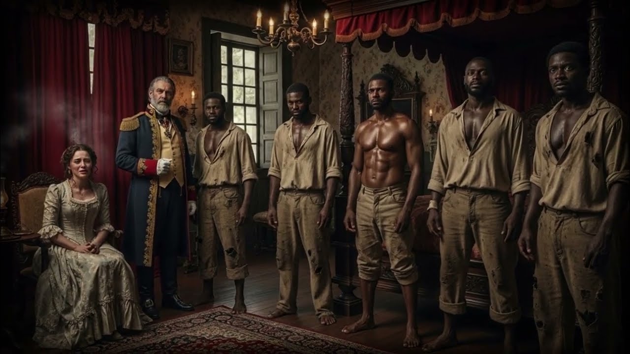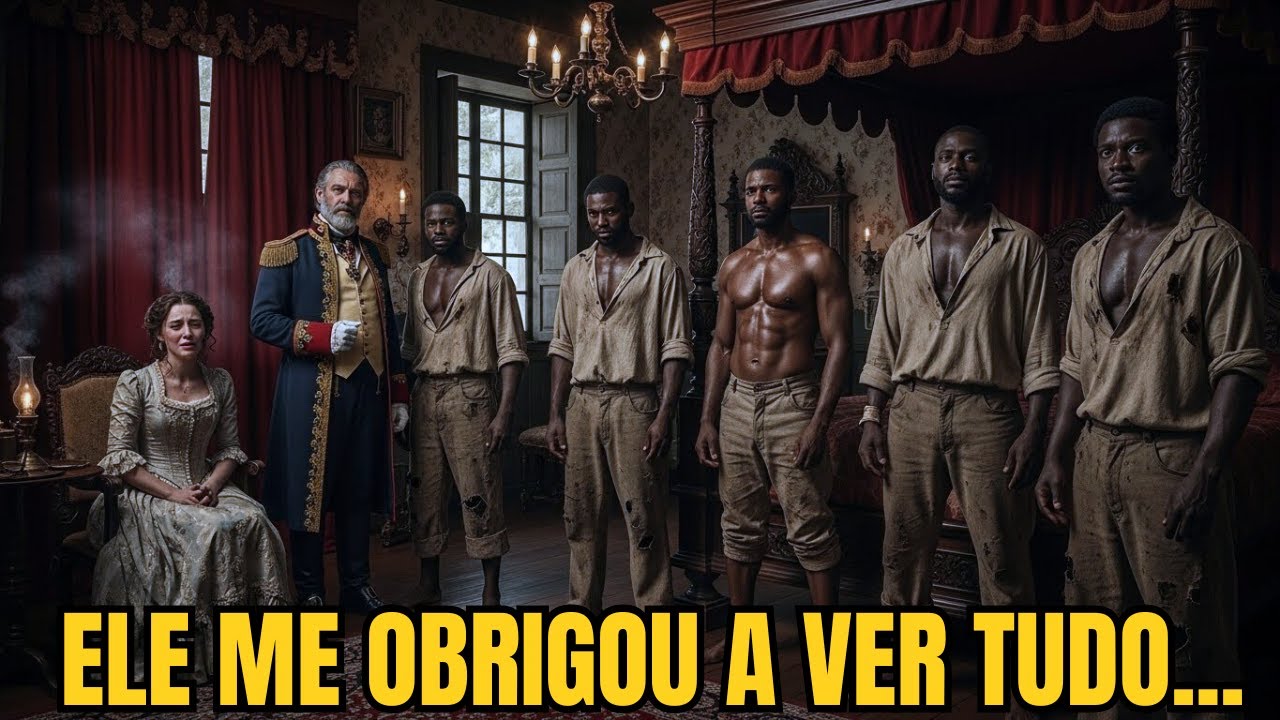 O que poucos sabiam, mas todos suspeitavam, era que o coronel mantinha um costume que envergonharia qualquer homem de bem, mas que ele praticava com a arrogância de quem se sentia acima de qualquer julgamento. Ele escolhera cinco homens entre os escravizados da fazenda, todos jovens, altos, fortes, de corpos trabalhados pelo sol e pelo eito, e os mantinha em uma condição que destruía não apenas suas dignidades, mas também suas almas. Eram eles Tobias de 28 anos, com cicatrizes nas costas e olhos que pareciam guardar tempestades. Lourenço, de 30 anos, o mais alto de todos, com mãos enormes que tremiam toda vez que era chamado à Casa Grande. Silvestre, de 25 anos, que cantava baixinho nas noites de lua cheia, como se a música pudesse limpar o que sentia por dentro. Apolinário, de 29 anos, que mantinha o rosto sempre sem expressão, como se tivesse aprendido a morrer em vida. E Marcolino, de 26 anos, o mais jovem do grupo, que ainda chorava em silêncio quando achava que ninguém estava vendo. O coronel não os queria apenas para o trabalho pesado da lavoura, embora eles também cumprissem essa função durante o dia, queimando sob o sol inclemente. Ele os convocava à Casa Grande em momentos específicos, geralmente à noite, quando as sombras encobriam os corredores e o silêncio da propriedade se tornava cúmplice de seus desejos. E o que tornava tudo ainda mais cruel era que ele obrigava dona Eugênia a estar presente. Assim, assentava-se em uma cadeira no canto do quarto grande, com cortinas de veludo vermelho, e olhava para o chão enquanto lágrimas silenciosas escorriam por seu rosto pálido.