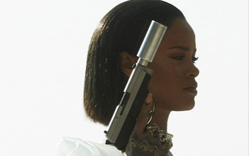 Directed by Harmony Korine, the video starts off with Rihanna freeing the nipple, while wearing a lace thong and a sheer robe, with a gun in one hand and a blunt in the other. (Shockingly, there are no Fenty x Puma Fur Slides or Stance socks in sight.)